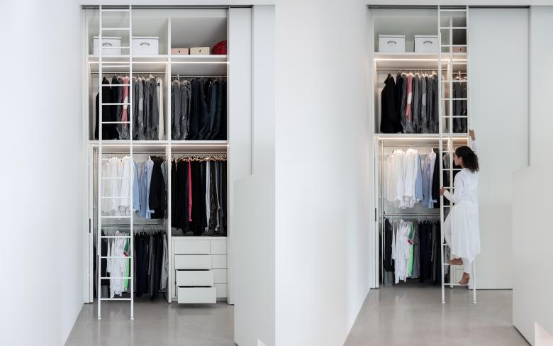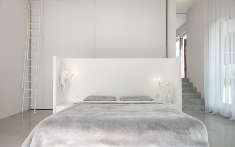 Auf ein beachtlich hohes Möbel trifft man auch im Schlafzimmer: Hinter dem Bett ragen die Schiebetüren des Kleiderschranks 4 m in die Höhe.