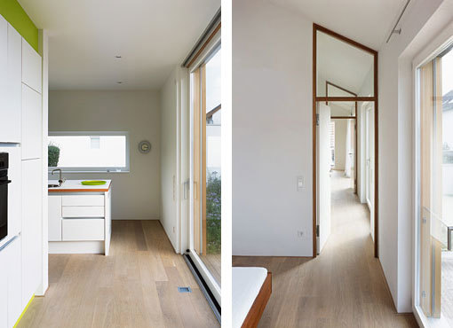 Die Treppe, quergestellt, stemmt sich dem Raumfluss entgegen, einen Keller gibt es nicht. Beim Durchschreiten der Raumfolgen wird das Prinzip des Grundrisses klarer: keine Innenwand berührt die Aussenwände, man umrundet das Zentrum des Hauses, den Essplatz, auf verschiedenen Wegen. Klare Fluchten wechseln mit überraschenden Ausblicken, an jedem Punkt des Hauses ist seine volle Grösse spürbar. Der Eingang, der örtlichen Typologie folgend auf einen Hofraum orientiert, unterstützt durch seine Lage am Hausgiebel das Konzept der langen Fluchten.