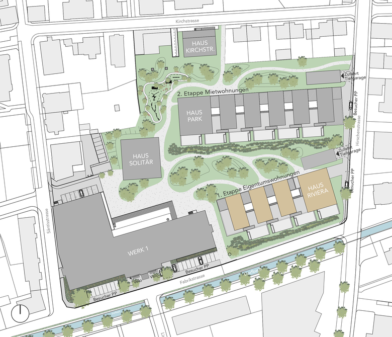 Das Areal mit der historisch wertvollen Schiffli-Stickerei an der Fabrikstrasse ist aufgrund seiner zentralen Lage im Ort in unmittelbarer Nähe zu den wichtigsten öffentlichen Bauten von grosser Bedeutung. Der zur Lindenwiesstrasse hin orientierte Kopfbau mit den Flügelbauten zeigt eine städtebauliche Haltung, welche mit der geplanten Wohnüberbauung weitergeführt werden soll. In diesem Sinne werden zwei grossmasstäbliche Hauptbauten und als westlicher Abschluss ein markanter Solitär gesetzt, die durch ihre periphere Setzung im Zentrum der Siedlung eine attraktive Parkanlage entstehen lassen. Mit der Analogie zur vorhandenen Masstäblichkeit entsteht einerseits die erforderliche Urbanität, anderseits eine Verbindung zwischen dem grobmaschigen Industriequartier im Süden und dem kleinmasstäblichen Wohnquartier im Norden. Das Ziel der Gemeinde und der Wettbewerbsjury, an diesem Ort „Mit neuen, innovativen Formen der Nutzung und des Zusammenlebens einen positiven Impuls zum urbanen Leben in Gossau zu schaffen“ kann aus unserer Sicht mit diesem grosszügigen und identitätsstiftenden Bebauungskonzept angemessen umgesetzt werden.