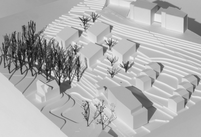 Gemäss Siedlungskonzept lassen sich acht Wohneinheiten in vier Doppeleinfamilienhäusern realisieren. Durch ihre schachbrettartige Anordnung entstehend grosszügige, miteinander verbundene Aussenräume, die Häuser erhalten durch ihre versetzte Situierung die erforderliche Individualität. Die Wohneinheiten sind gegeneinander höhenversetzt. Die vier Doppelhäuser schmiegen sich mit ihren Pultdächern an den Hangfuss von Birnbäumen.