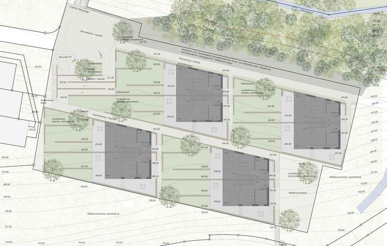 Die ältere benachbarte Wohnsiedlung entlang der Birnbäumenstrasse bildet ein klares und einfach lesbares offenes Siedlungsmuster mit vorwiegend Ost-West-orientierten Reihenhäusern und durchlässigen, den Hang erlebbar machenden Zwischenräumen. Obwohl die neue Bebauung verdichtet sein wird, sollen die prägenden Elemente der Gebäudeorientierung, der Dimension, der Geschossigkeit und der gegenseitigen Gebäudezuordnung übernommen werden.