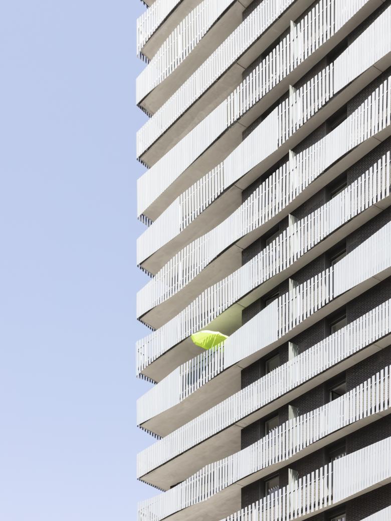 Beim 50 Meter hohen Turm, der 77 Sozialwohnungen mit bis zu fünf Zimmern birgt, täuschen die Alulatten der Balkonbrüstungen dreidimensionale Ausbuchtungen vor: durch unterschiedlich dichte Anordnung sowie gewellte oder gezackte Ober- und Unterkanten in der Art eines Trompeloeils.