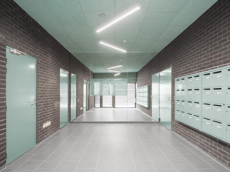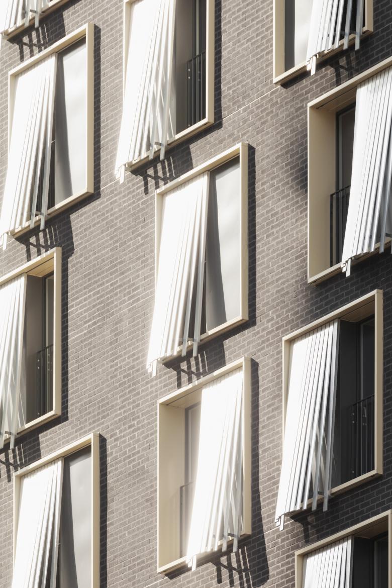 Die unterschiedlichen Nutzungen werden in einer formal differenzierten, aber in Materialität und Textur verwandten Fassadenausbildung zum Ausdruck gebracht. Beide eint eine Hülle aus dunklen Klinkerriemchen, akzentuiert durch Elemente aus silbrigem Aluminium: Vor den Fenstern der 55 Arbeiterapartments sorgen verschiebbare Brisesoleils aus Alu-Lamellen für beschwingte Akzente.
