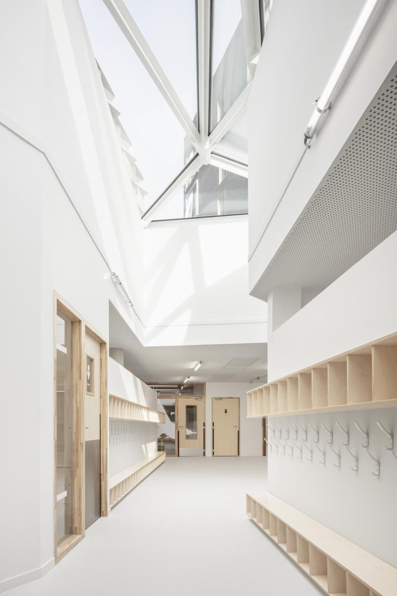 Einander diagonal gegenüberliegend, sind die Wohntürme auf dem Grundstück so angeordnet, dass Park- und Weitblick gewährleistet ist. Als verbindender Sockel fungiert das in Holz-Beton-Verbundbauweise ausgeführte sternförmige Kindergarten und Krippengebäude, dessen Schenkel zwei gegenüber dem Straßenniveau tieferliegende Höfe umschließen.