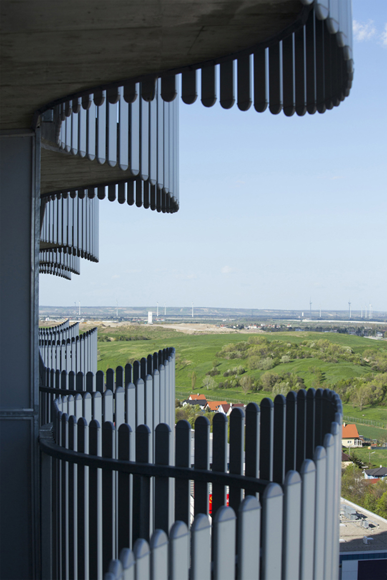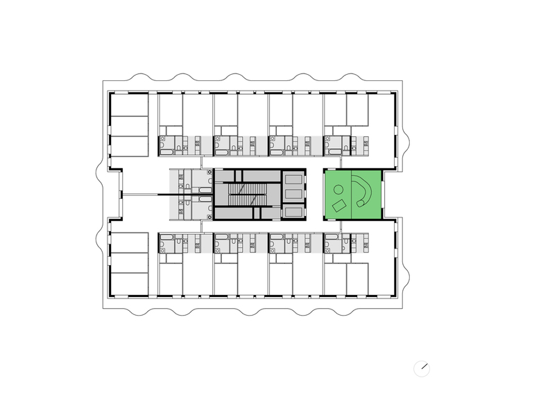 Antwort – Teilweise mehrgeschossige Gemeinschaftsräume werden über sämtliche Geschosse verteilt und liegen gegenüber der Lifte. Interne Kommunikation der Bewohner wird durch diese vertikale Dorfstraße stimuliert.