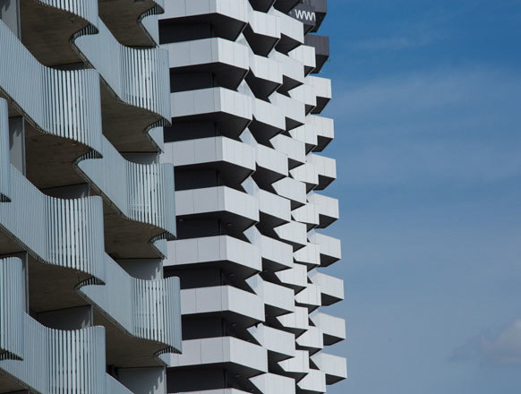 Ein reduziertes konstruktives System ermöglicht flexible, erweiterbare, zusammenschaltbare Wohnungsgrundrisse. die Balkonzone erhält Erweiterungen, die sich als poetisches Fassadenspiel artikulieren. Tiefe Fensternischen bieten Geborgenheit.