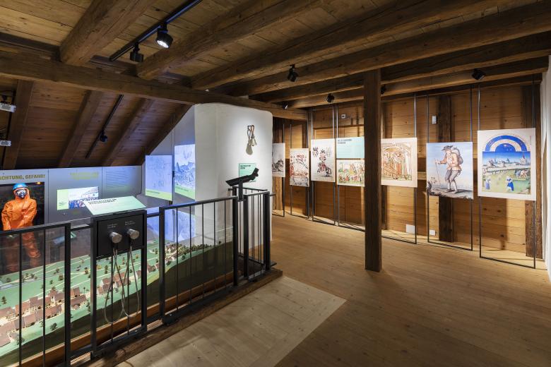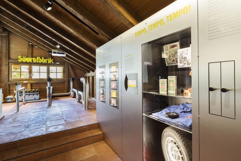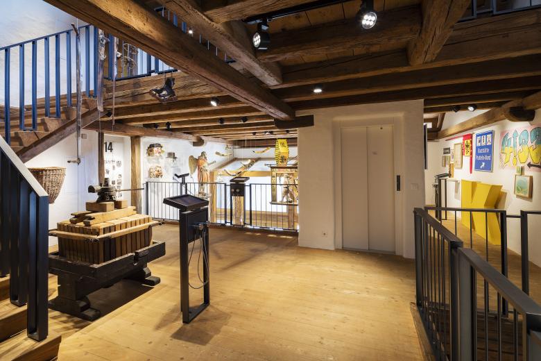 Für die neue Inszenierung der Dauerausstellung im Bürgerhaus Pratteln hat raumprodukt die Pratteln Geschichichte von der Frühzeit bis hin zur industriell geprägten Gegenwart inszeniert. Im historisch gewachsenen verwinkelten Bau wurde die massiven Holzgeländen entfernt und durch eine filigrane transparente Mettalkonstruktion ersetzt. Durch diesen Eingriff entstehen Lufträume, in denen die Objekte der älteren und jüngeren Geschichte Pratteln präsentiert werden, die für die Identität der Industriegemeinde Pratteln wichtig sind. Das Geländer zieht sich wie einen roten Faden durch die Ausstellung und leitet die Besucherinnen und Besucher zu verschiedenen Interaktionen, die vertiefende Einblicke und Informationen ermöglichen.