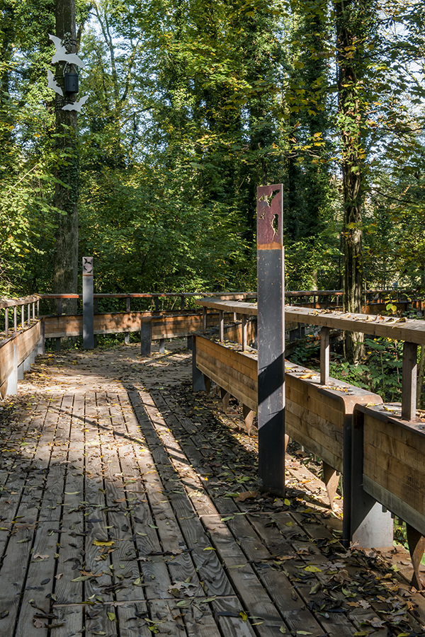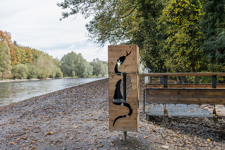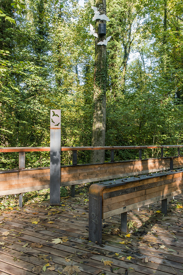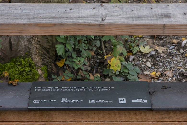 Für den Erlebnissteg im renaturierten Limmat-Auenpark Zürich hat raumprodukt interaktive Stationen entwickelt, die spielerisch Wissenswertes zur Tier- und Pflanzenwelt vermitteln.
