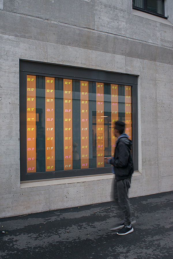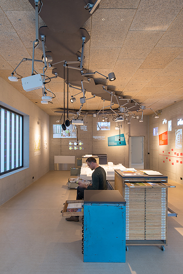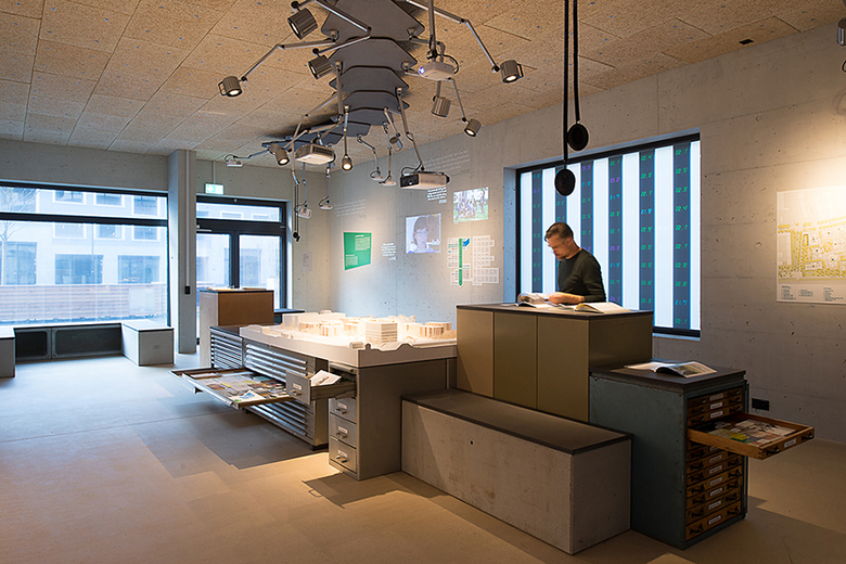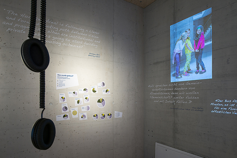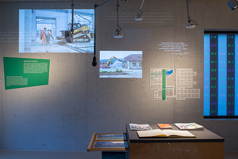 Von einem zentralen «Deckentier» aus werden Bilder, Zitate aus dem Entstehungsprozess und Interviews mit Bewohnern thematisch gebündelt auf die umliegenden Wände projiziert. Ein lebendiges Archiv lädt die Besucher zusätzlich ein, sich in die vielfältigen gefüllten Schubfächer mit Bauplänen, Materialmustern, Publikationen etc. zu vertiefen.