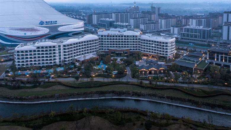 The 4-star leisure and theme hotel on the banks of a lake, nestled in a subtropical landscape, is part of a tourism complex that the real estate giant 'Wanda Group' has been investing in since 2016 and which in turn is part of a much larger urban development project called 'Chengdu Wanda City'.