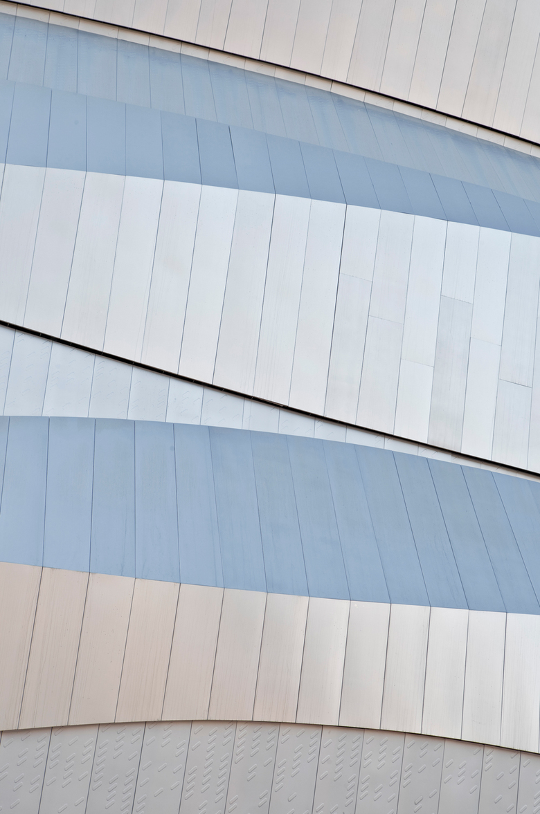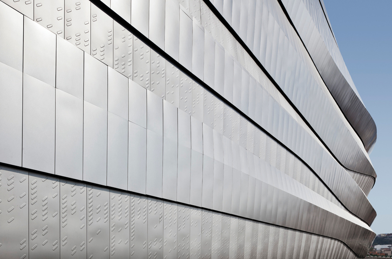 At night the hollow cavity between the layers of the façade is engulfed in light that subtly escapes through the fine reliefs formed at the folds in the skin. The façade transforms pearance during the day to a dynamic form accented by light.