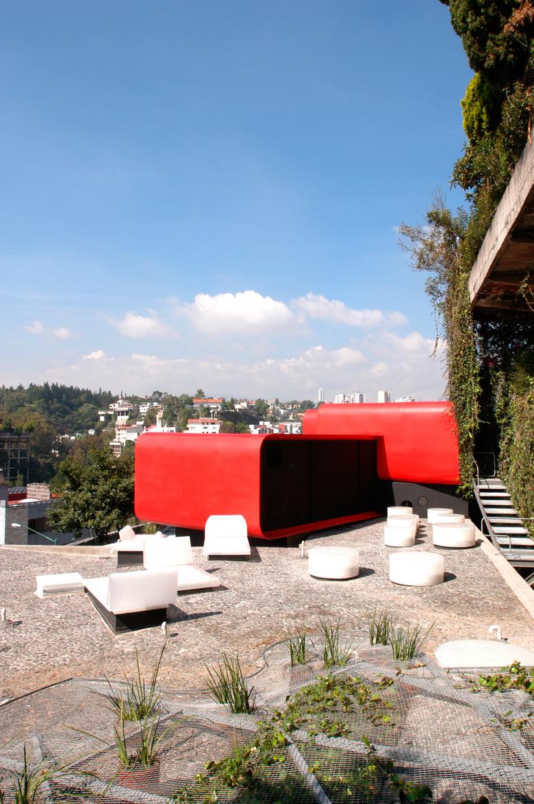 Located in Tecamachalco, State of México, on a hillside overlooking Bosques de Reforma, an existing late 60’s house required a renovation and an extension. Since the client bought the house for its distribution, the existing house was carefully cleaned out, leaving bigger and better areas, then a new part of the program was required, an independent apartment for the client’s daughter. Inside the garage there are 2 separate entrances, providing total independence to the extension, which is accessed through a spiral staircase going 2 flights up. Resembling a ballet, displaying 2 bodies in motion, the looping sensual forms of changing angles coming out of every curve, where inspired by the ballet dancer who is going to inhabit it. The apartment consists of 2 half levels, the first contains the kitchen, dining and living area, then a half flight down; the t.v. room and the master bedroom. Taking advantage of the roof of the existing house and its skylights, this roof becomes a terrace built with the remaining of the chipped lava rocks used for the main wall of the house, the skylights become acrylic stools, benches and chaise lounges that change color with an LED system. A selection of pre-hispanic organ plants adds a touch of vegetation giving this area a lunar feel.