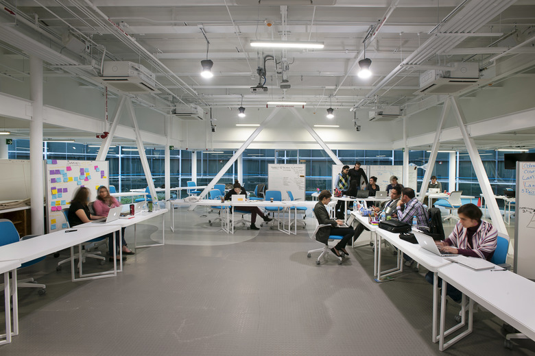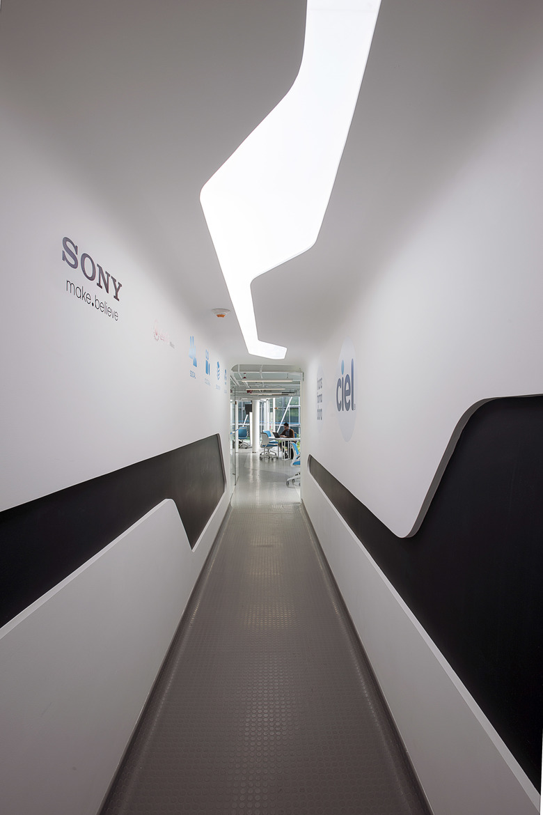 The customized furniture, includes interchangeable modules that activate a flexible configuration interior where different groups are able to work in various topics and re-arrange the layout as their work flow requires to. The shapes within the space, as well the curved windows are reminiscent of Ciel’s “double droplep” logotype and a representation of the dynamic work space it holds.
