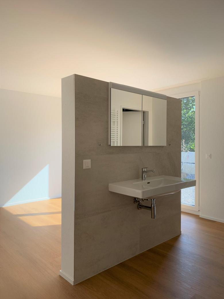 Leicht unterhalb der Strasse liegen der Eingang, Kochen/ Essen/ Wohnen, ein Arbeits- oder Gästezimmer und eine Dusche. Die sehr grosszügige Terrasse wird durch das Gebäude und der Garage von der kleinen Quartierstrasse abgeschirmt.