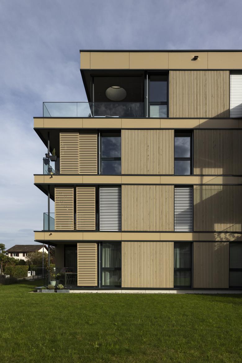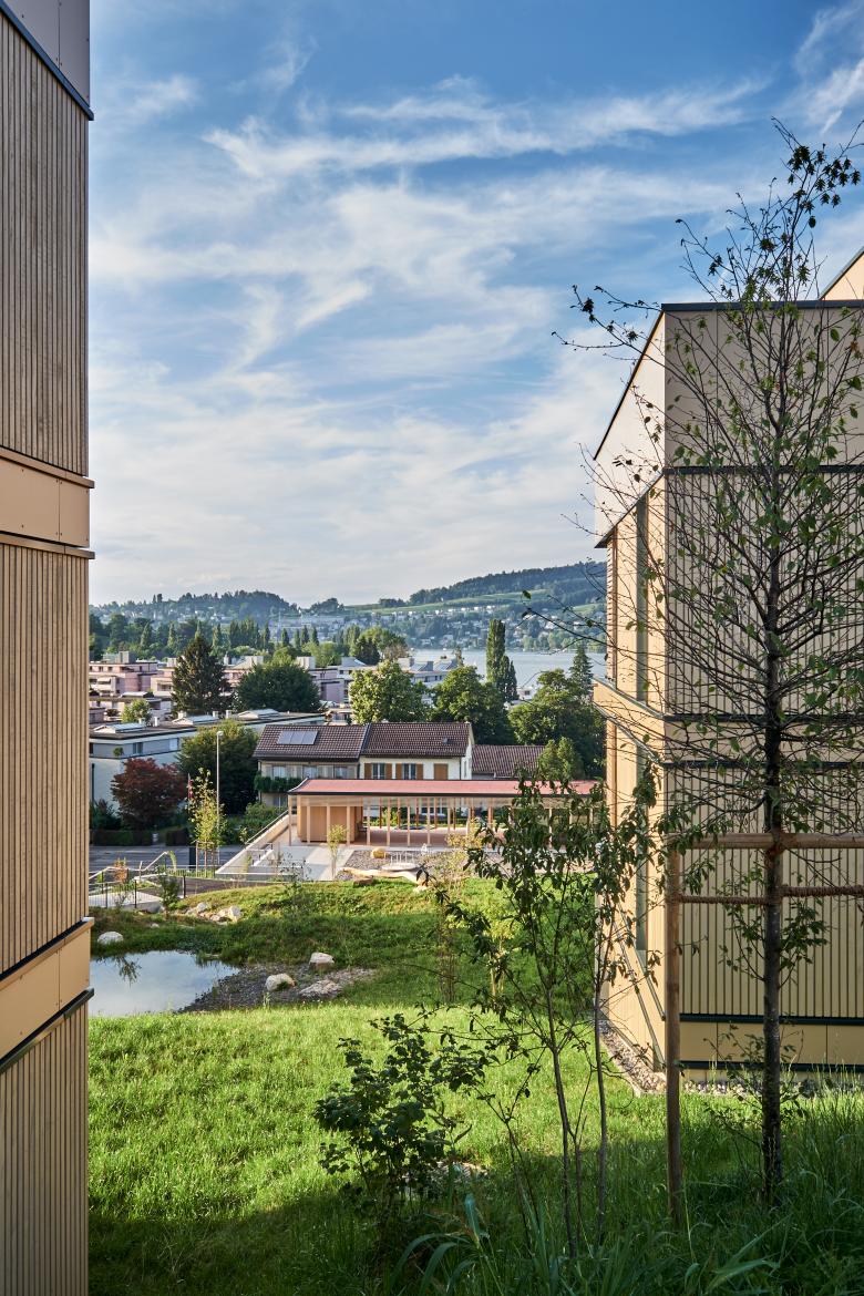 Die Lage und Grundstückform sind bestimmend für die Bebauungsstruktur. Das Konzept sieht fünf Baukörper als Mehrfamilienhäuser vor. Entlang der Ost-Grenze sind drei Baukörper von unten nach oben sowie seitlich am Hang hinauf gestaffelt und bilden den Abschluss zu der bestehenden Villa. Die beiden weiteren Baukörper sind an der Westkante so platziert, dass dem Aussenraum und dem Grenzbach genügend Raum gelassen wird.