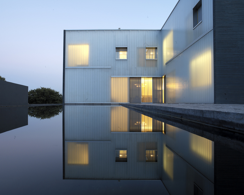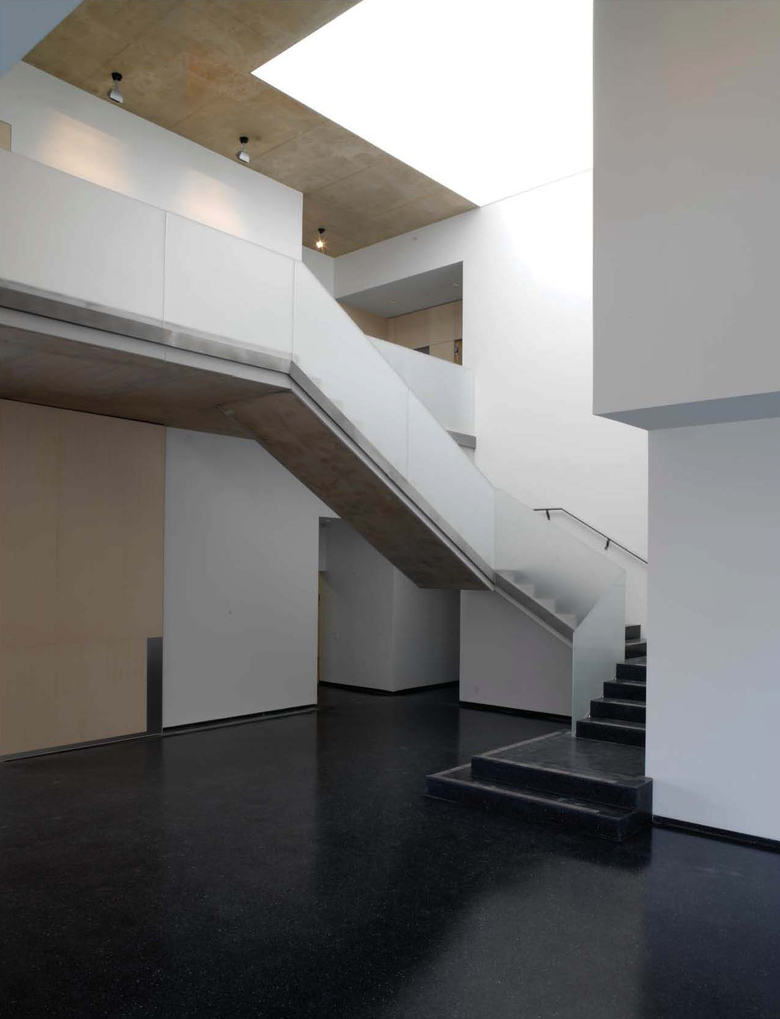 Der gradlinige Grundriss lässt sich bewusst nicht auf die leicht diagonale Form des Baugeländes ein. Während Linienführung und Formen der Architektur klar und einfach sind, verleihen sandgestrahlte, lichtdurchlässige Paneele aus Strukturglas dem Ganzen ein etwas unbestimmtes Erscheinungsbild. Die bei dem Projekt verwendeten Werkstoffe stellen ein wichtiges Merkmal des Entwurfs dar. Der anthrazitfarbige Beton und das milchige Glas sind vom schwarzen Fels und weißen Schnee der Schweizer Alpen inspiriert.