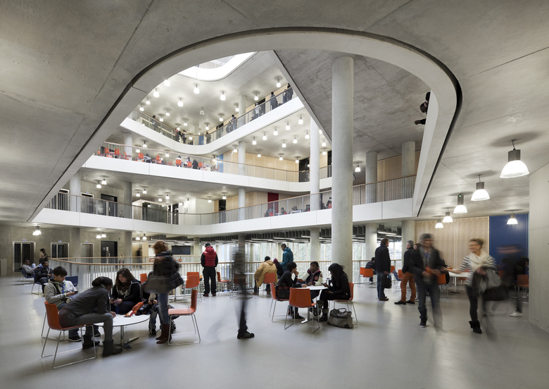 The respective floor plans surrounding the atrium have visual connections from one floor to the other, making the atrium a dynamic centre and the heart of the College. The large atrium, which on some floors extends all the way to the façade, enhances the relationship between the inside and the outside. It offers light-filled, open and inclusive spaces which encourage the interaction between students.