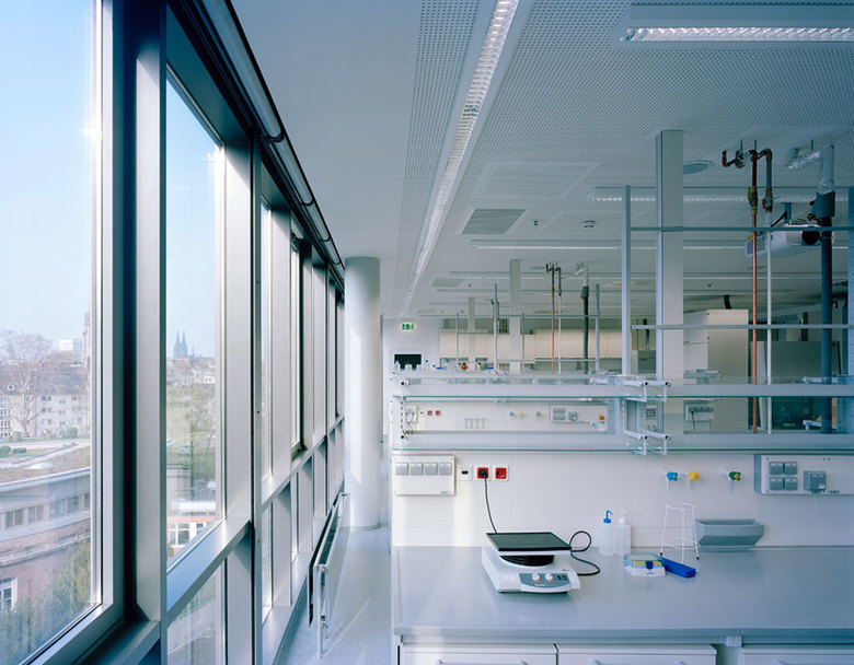 Im biowissenschaftlichen Zentrum sind die Institute für Botanik, Zoologie und Entwicklungsbiologie angesiedelt. Der kompakte Baukörper fügt sich in die vorhandene orthogonale städtebauliche Struktur.