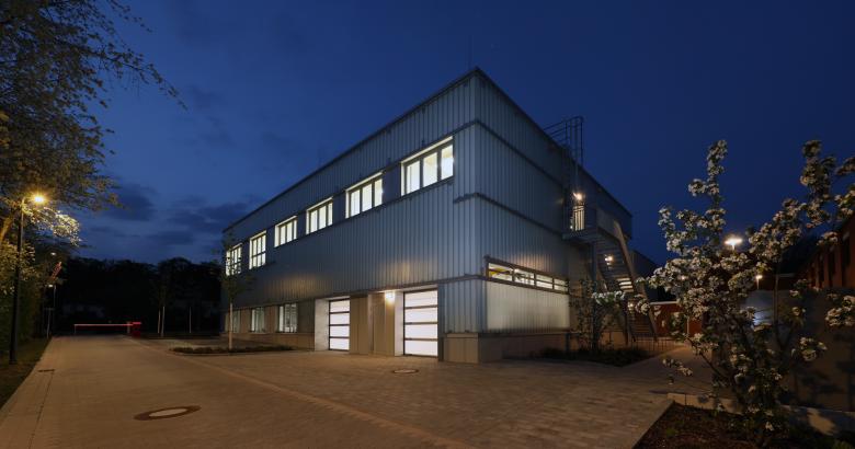 Über das Foyer mit Haupttreppenhaus und Aufzug wird im EG die Fahrzeughalle mit KFZ-Werkstatt, EMV-Kammer und Nebenräumen erschlossen, im OG sind über einen innenliegenden Flur verschiedene Büros und Labornutzungen erschlossen. Über eine aussenliegende Stahltreppe an der Südfassade des Gebäudes wird der zweite Rettungsweg aus dem OG sichergestellt.