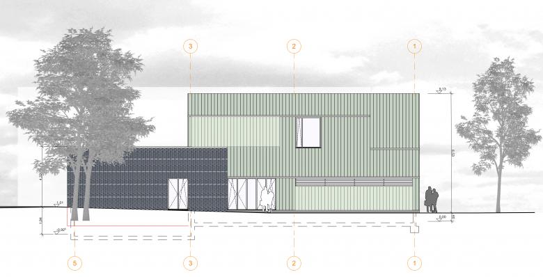 Der Hauptzugang erfolgt im Osten aus der Richtung des Gebäude L. Der Neubau bildet durch das zweigeschossige Hauptgebäude und die eingeschossige EMV-Absorberkammer im Zusammenspiel mit Gebäude L einen angenehm proportionierten Vorplatz zum Hauptzugang.
