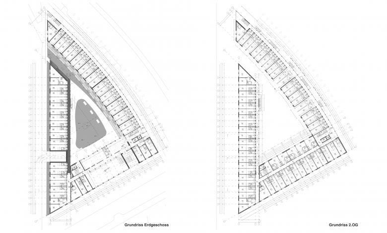 Der Erschließungs- und der Gemeinschaftsbereich sind zur öffentlichen Grünfläche hin ausgerichtet. In den übrigen Flächen des Erdgeschosses und den oberen Geschossen werden über offene Laubengänge und einen Erschließungsflur im südlichen Bauteil insgesamt 302 Apartments für studentisches Wohnen erschlossen. Die Appartements orientieren sich mit den Aufenthaltsräumen zu den lärmabgewandten Seiten und dem Innenhof.