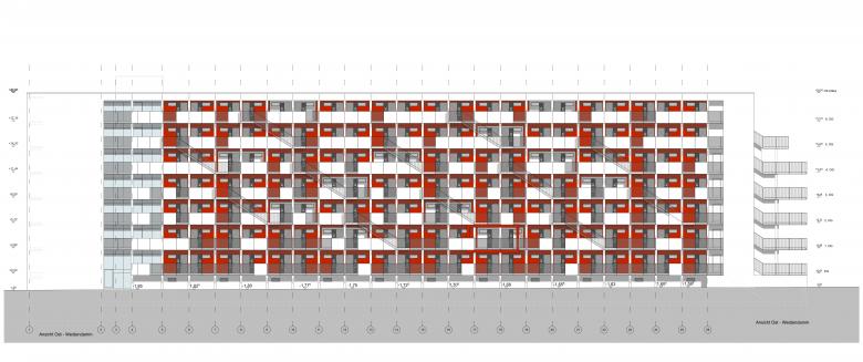 Die Gebäudeteile werden in konventioneller Bauweise im Wärmedämmverbundsystem errichtet und treten als farblich abgestimmte Gebäudekörper in Erscheinung. Markant sind die außen liegenden Treppenanlagen zum „Weidendamm“ sowie die hervortretende Rahmung einzelner Appartements im Innenbereich. Die Außenfassaden der Baukörper werden hell verputzt, besondere Flächen davon sind rot bzw. grau abgesetzt.