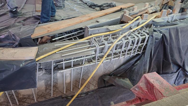 Beide TWIST-Schalen liegen auf einer Stahlkonstruktion und setzen am Boden auf ein Fundament auf. Als Anschlussbewehrung wurde der Glasfaserverbundwerkstoff Combar eingearbeitet und bei der Fertigung der Tragschale im Spritzbetonverfahren einbetoniert.