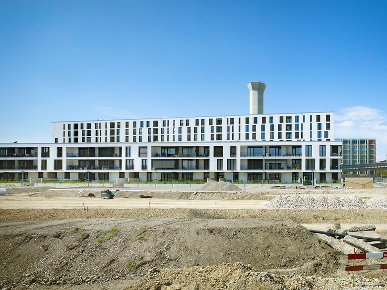 Die Bebauung ist als einheitliche Grossform mit unterschiedlichen Gebäudehöhen, Höfen und Einschnitten konzipiert. Dieses Konzept des differenzierten Volumens soll durch die Fassadentypologie verstärkt und präzisiert werden. Offene und unterschiedliche, geschlossene Elemente gliedern das lange Gebäude. Vier eingeschossige Höfe strukturieren das Erdgeschoss und bilden zusammenhängende Nutzflächen, die modular und frei unterteilbar sind. Die vorgeschlagene Erdgeschossform, die sowohl als Grossraum als auch als Kleinsteinheit genutzt werden kann, stellt ein neuartiges Konzept dar. Die grosse Flexibilität, die Vielfalt der Nutzungsmöglichkeiten sowie die Attraktivität der zu den Höfen hin orientierten Räume reduzieren das Risiko des Leerstands. Der achtgeschossige Hochbau auf der Westseite der Parzelle wird über vier Infrastrukturkerne effizient erschlossen. An diesen sind vier- bis sechsspännige Anlagen mit insgesamt 126 Geschosswohnungen unterschiedlicher Grösse angeordnet. Der östliche, dreigeschossige Gebäuderiegel nimmt 48 Geschosswohnungen auf, grösstenteils grosszügige Familienwohnungen. Die Erschliessung erfolgt über sechs Treppenhäuser.