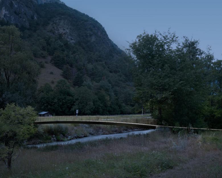 Die Konstruktion kombiniert filigrane Ästhetik, indem sie sich harmonisch in die Umgebung einfügt, mit technischer Robustheit. Durch den trapez- förmigen Querschnitt des Trägers und die minimierte Au!bauhöhe erscheint sie schlank über der Vispa. Der Träger ist bewusst dunkel gehalten, sodass er optisch in den Hintergrund tritt und sich nur der Gehbelag und das Geländer abzeichnet.
