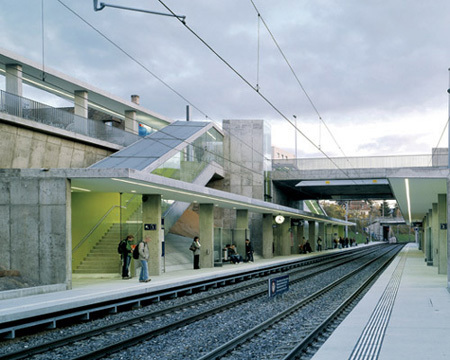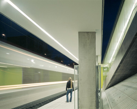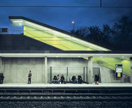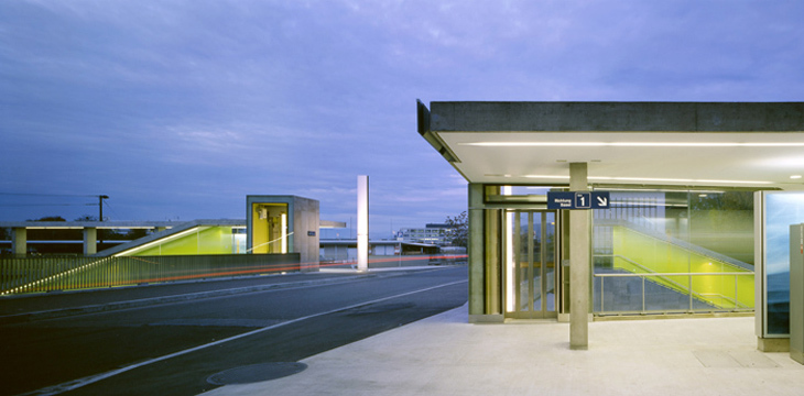 Die Bahnlinie Basel-Laufen-Delsberg liegt im Bereich der Haltestelle in einem tiefen Einschnitt, der von einer Strassenbrücke überspannt wird - eine für städtische Verhältnisse typische Situation. Die Verknüpfung der beiden Verkehrsebenen erfolgt über vier Treppen und zwei Lifte, die auf der Brücke einen neu definierten Ort im Quartier schaffen. Markante Betondächer führen in einer Linie vom Velounterstand auf der Brücke über die leicht aus der Hauptachse gedrehten Treppen bis zu den 65 Meter langen Perrondächern: Brücke und Haltestelle scheinen miteinander zu verwachsen. Die kräftig grün-gelbe Farbgebung der Innenwände der Treppenhäuser weist unverkennbar den Weg; vor allem Nachts, wenn die Flächen hell angestrahlt werden.