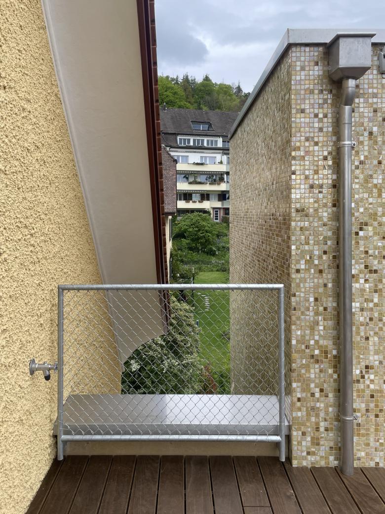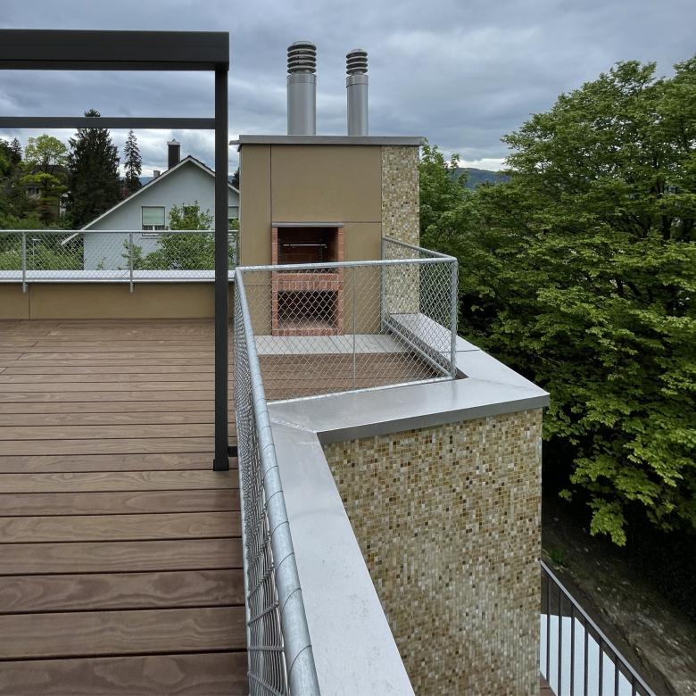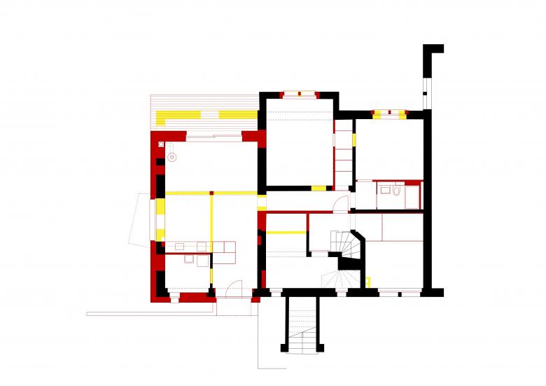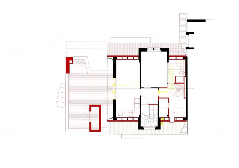 Der Anbauteil erhielt eine Aufstockung in gewichtssparender, vorfabrizierter Holzbauweise. Das neue Volumen schliesst im OG mit zwei markanten Einschnürungen so an die Giebelfassade des Bestandes an, dass das weit vorstehende Steildach des Altbaus nicht tangiert wird. Die dadurch geschaffenen eingezogenen Terrassen prägen den Grundriss im OG und die Dachterrasse der Wohnung darüber.