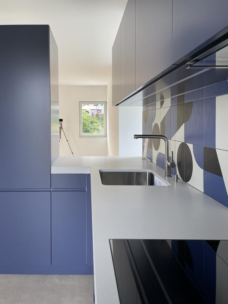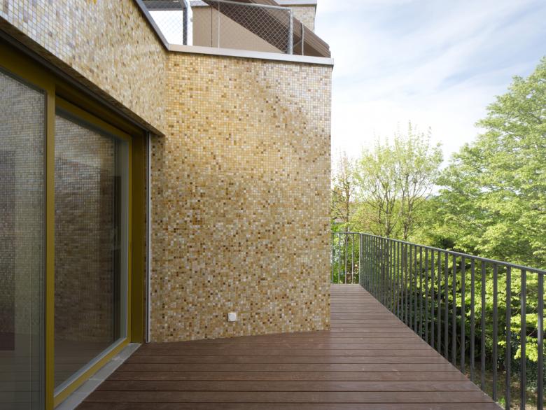 Der aufgestockte Anbau hingegen erscheint mit seiner expressiv modellierten Volumetrie und den wenigen, gezielt positionierten Fenstern in der vorgehängten Fassade als Neubauteil. Die Farbigkeit von Glasmosaik und Fugenfarbe vermitteln zum Altbau, der verputzte Sockel bindet die beiden Gebäudeteile zusammen.