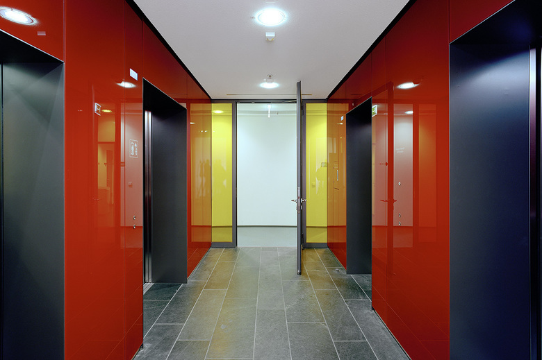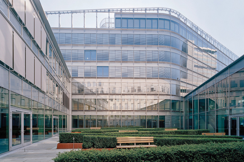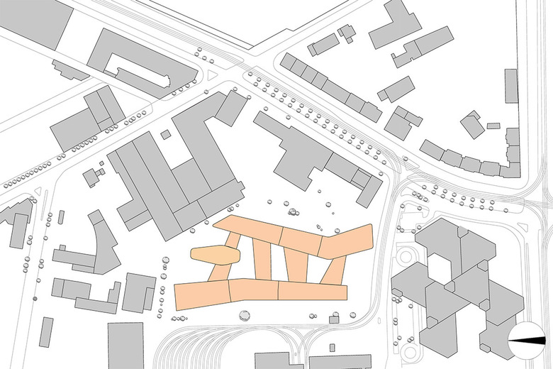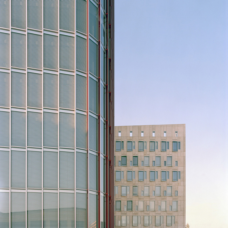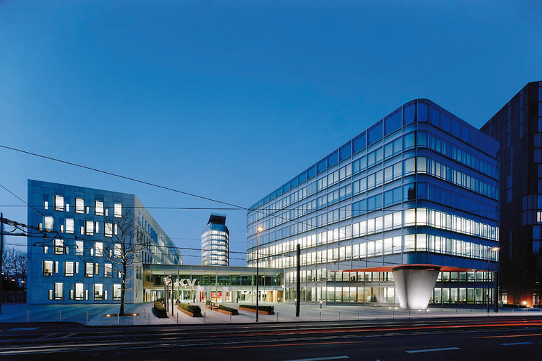 Zwei sich gegenüberliegende Gebäuderiegel mit einer gegenläufigen, von 7 auf 5 Geschosse sich neigenden Attika, sind so angeordnet, dass der Besucher von der Scheidtweiler Straße über einen Vorplatz, wie selbstverständlich, in den Gebäudekomplex hineingeleitet wird. Die beiden Riegel sind durch zwei- bis dreigeschossige Querriegel miteinander verbunden. Durch diese Zonierung entstehen drei großzügige Innenhöfe, die die Aufenthaltsqualität und Orientierung im Gebäudekomplex erhöhen. Seinen städtebaulichen Abschluss bildet der 14- geschossige Büroturm im Norden.