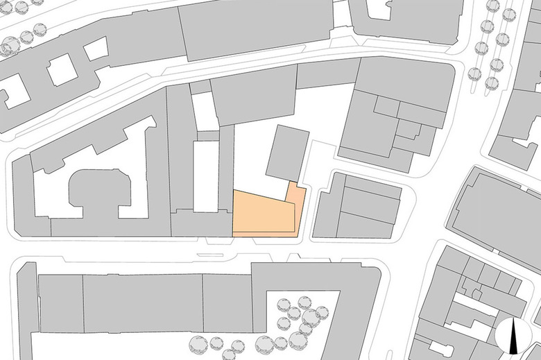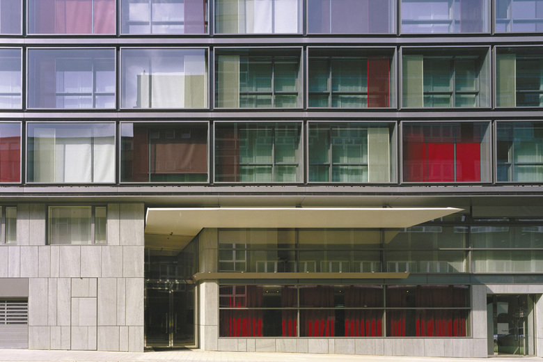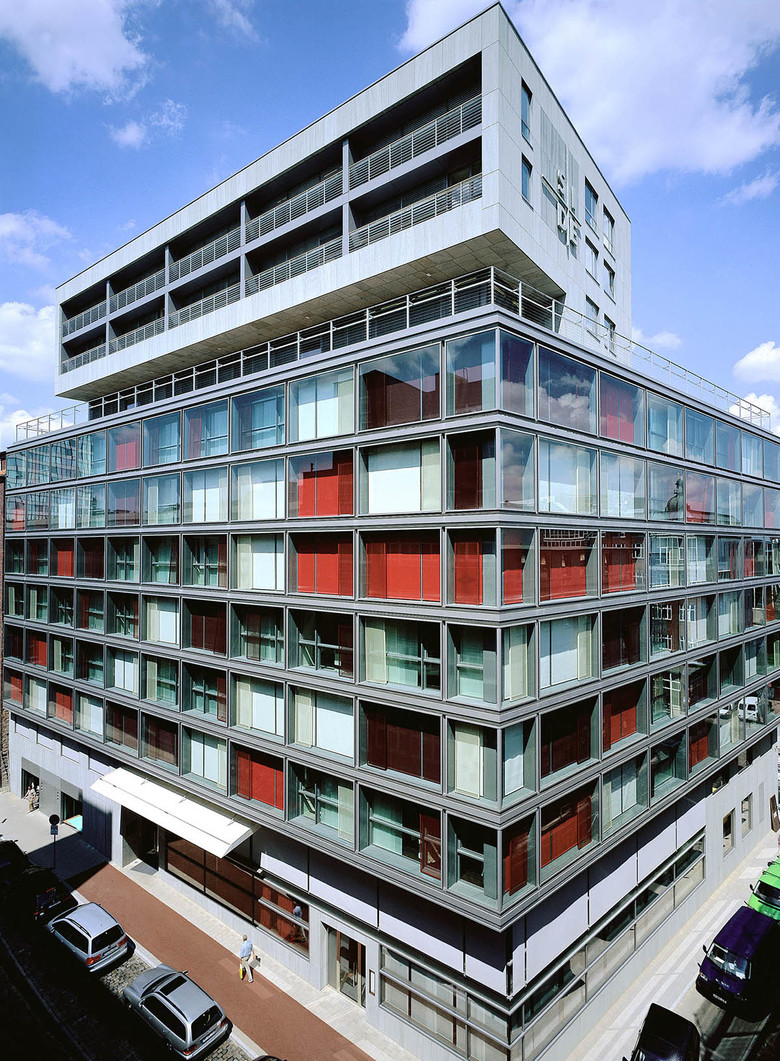Umschlossen wird das Atrium von zwei unterschiedlichen Baukörpern. Ein gläserner Winkel schließt den städtebaulichen Block zur Straßenseite. Seine Doppelfassade dient zugleich als Klima- und Lärmpuffer. Der rückwärtige Gebäudekörper ist mit einem hellgrünen Naturstein bekleidet und überkragt mit seinem prägnanten Kopf den vorderen Gebäudeteil um vier Geschosse. In den Untergeschossen befinden sich ein Konferenzsaal für 200 Personen sowie ein hochwertiger Wellnessbereich mit Pool, Dampfbad, Fitness- und Massagebereich. Außerdem werden 100 PKW-Stellplätze in einem automatischen Parksystem vorgehalten.