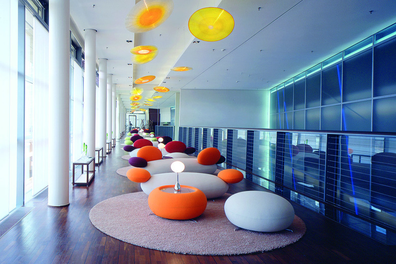 Zwei raumhohe Lichtfelder, die im ruhigen, zeitlichen Wechsel leuchten, prägen diesen Raum. Vom Atrium aus erreicht man die Konferenzräume, Medienlounge und Bilbliothek sowie die Hotelbar und das Restaurant „(m)eatery bar“ im Erdgeschoss.