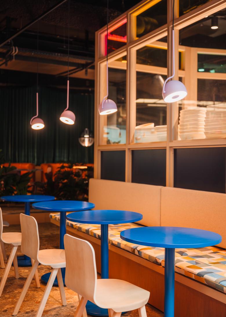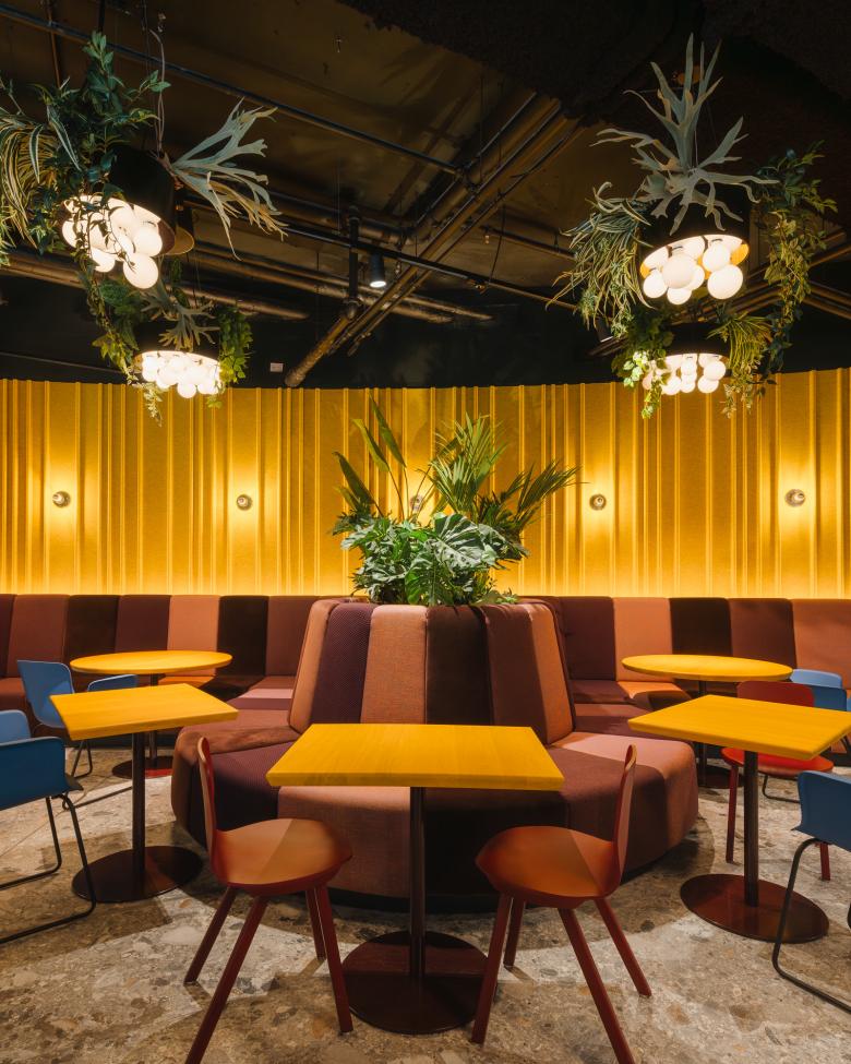 gestaltet sind, um das vielfältige Speisenangebot zu signalisieren. Während sich beispielsweise über der asiatischen Küche eine Lichtwolke aus Lampions bildet, werden an anderer Stelle mexikanische Tacos mit Pendelleuchten schmackhaft in Szene gesetzt. Über den Köchen schweben dimmbare Paneele, die sie ins rechte Licht rücken. Weitere Sonderanfertigungen sind in die Möbel integrierte Kragarmleuchten und die mit Pflanzen bestücktentellerförmigen Pendelleuchten.