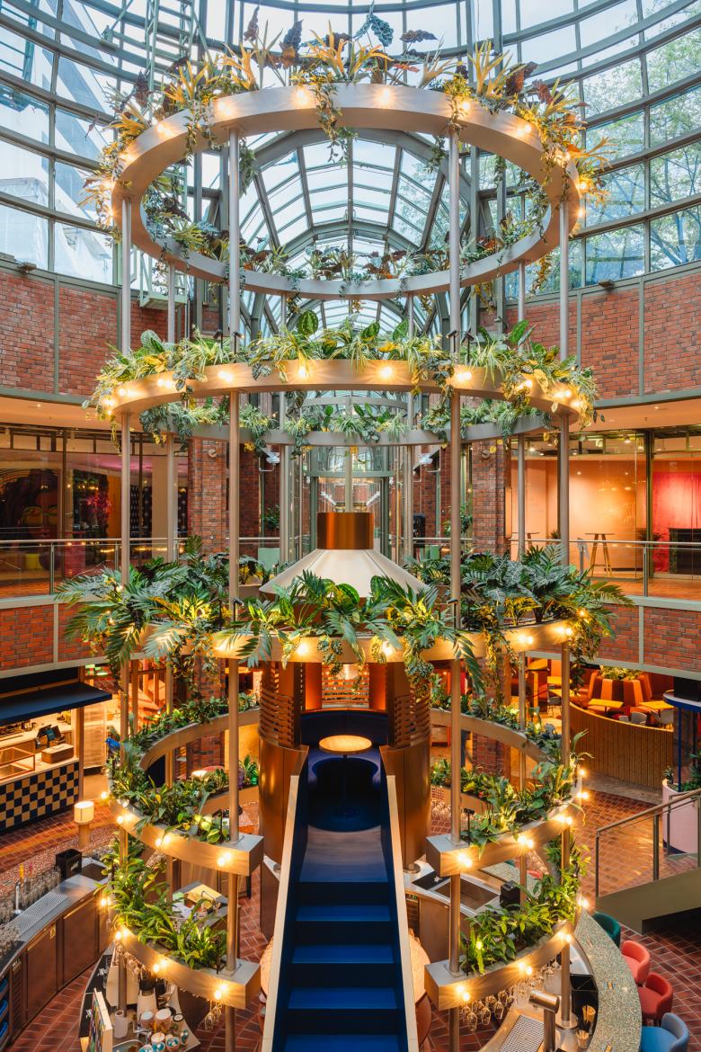 Umringt von insgesamt fünf horizontalen Pflanzringen, erstreckt sie sich bis über das Erdgeschoss des Hanseviertels hinaus. Sie sorgt für die nötige Fernwirkung und Orientierung. Um dieser exponierten Lage gerecht zu werden und die Beleuchtung präzise mit der Konstruktion und den Denkmalbehörden abzustimmen, haben Studio De Schutter mit dem Planungsteam von studio aisslinger und gmp Architekten das Herzstück als Modell im Maßstab 1:1 gebaut. Über einhundert Cabochons – die für Jahrmärkte typischen Kappenleuchten – verkünden das große TamTam. Die Beleuchtung für die in Ringen angeordneten Pflanzen wurde von Studio De Schutter mit integrierten Zoom-Strahlern inszeniert.