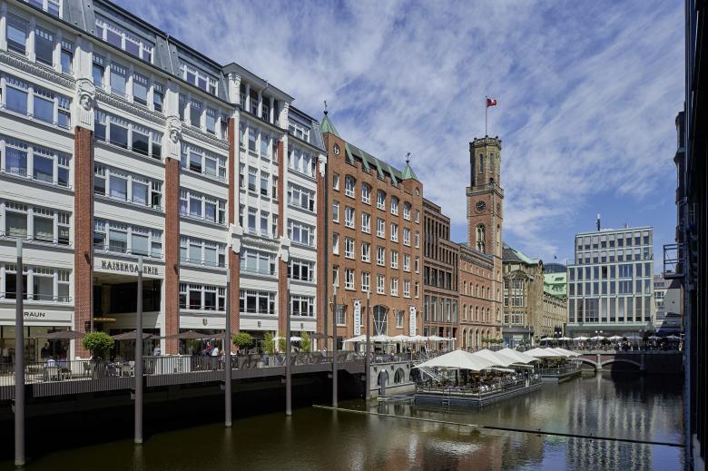 Das Gebäude vermittelt geschickt zwischen seinen Nachbarn Alte Post und Galleria Hamburg, die seit kurzem ebenfalls unter Denkmalschutz steht: Die unterschiedlichen Traufhöhen werden weitergeführt und durch abgewinkelte Abschnitte in der Fassade vereint. Das Straßenbild bleibt stimmig, während der eigenständige Gebäudecharakter durch Staffelungen hervorgehoben wird.