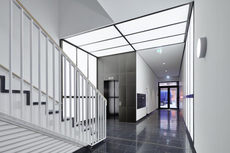 Die Einzelhandelsflächen der Nachbarbauten im Erd- und ersten Obergeschoss konnten nun sowohl zur Straße als auch zum Wasser durchgehend verbunden werden. Ab dem zweiten bis zum fünften Obergeschoss entstanden kleinteilige sowie zusammenhängend vermietbare Büroflächen, die im Mittelteil durch Lichthöfe belichtet werden