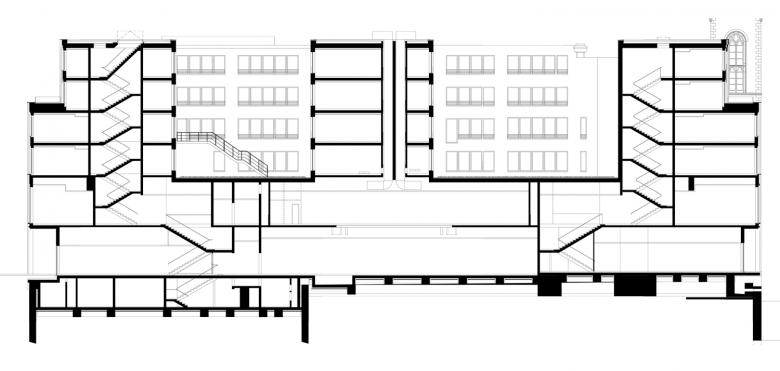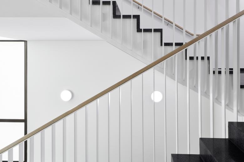 Die reiche Architektursprache der Umgebung mit ihren traditionellen Backsteinbauten findet sich in den Fassaden des Neubaus wieder. Raumhohe Fenster mit dezenten Rahmen aus eloxiertem Aluminium strukturieren die Oberflächen. In den Obergeschossen werden zusätzlich dezente Glasbrüstungen als Elemente französischer Fenster eingeführt.