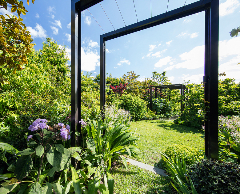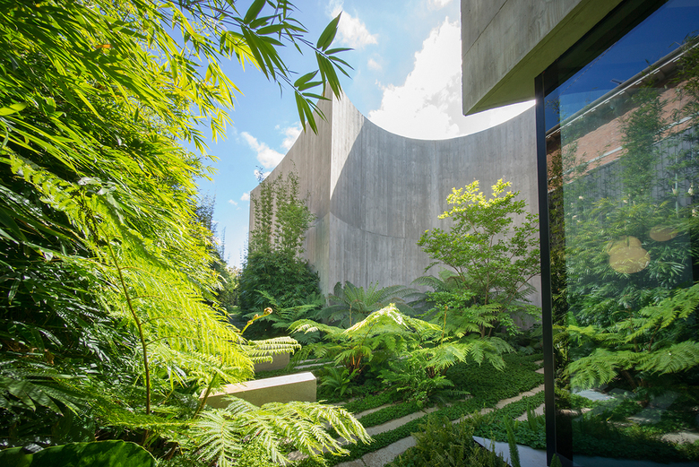 The south side of the house boasts a lush circular fernery nestled between the building walls. An array of layered plantings and a scattering of granite plinths create an exotic atmosphere.