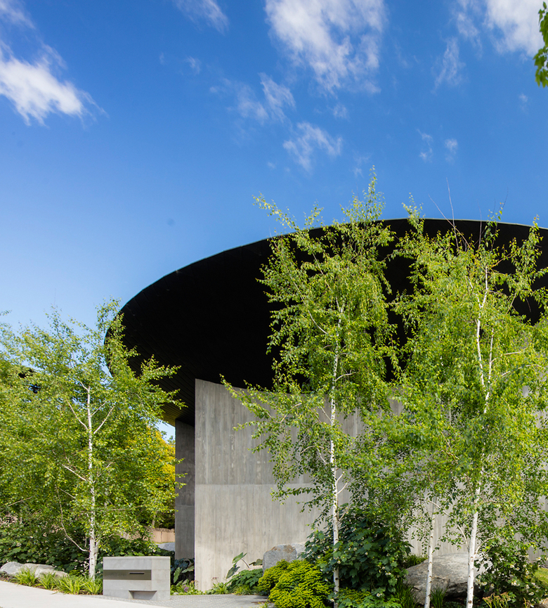 The verdant, diverse and textured forms of the garden provide a contrast to the muscular architectural concrete form of the building. The white painterly bark and delicate foliage of Silver Birches at the property’s Towers Road frontage act as a foil against the monumental raw concrete façade and provide filtered views through to the building.