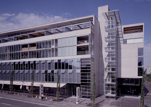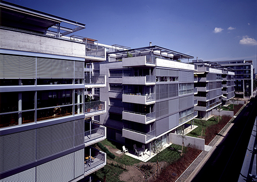 Industriebrachenumnutzung. Einseitig offene, 8- bis 9-geschossige Randbebauung mit vier freistehenden 6-geschossigen Innenhofgebäuden (vor allem Wohnnutzung).