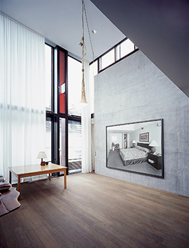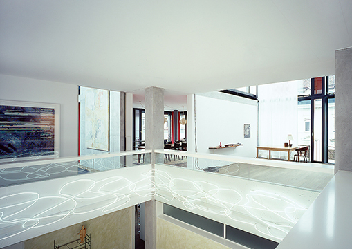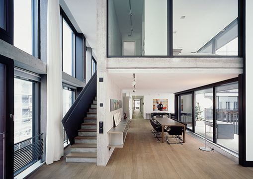 Die insgesamt fünf Wohnungen sind äusserst grosszügig bemessen; die drei grössten, mehrere Geschosse übergreifenden besitzen Dimensionen, welche ausserhalb der Innenstadt nur jeweils in einem Villenbau untergebracht werden könnten. Zweifelsohne am eindrucksvollsten ist die oberste Wohnung, welche von der Bauherrschaft bewohnt wird. Um eine zentrale Halle sind acht Raumbereiche so konfiguriert, dass sich verschiedene Durchblicke zwischen den Ebenen ergeben. Wirkt der auf dem System eines in neun Teilflächen aufgeteilten Quadrats entwickelte Grundriss auch zunächst schematisch, so erstaunt in der Realität eine komplexe Raumstruktur, bei welcher die tragenden Elemente auf das Notwendigste reduziert sind. Entstanden ist ein fliessendes Kontinuum, bei welchem oben und unten, rechts und links, hinten und vorne ineinander greifen. Die Treppen wurden auf ein Minimum reduziert, die Nasszellen sind wie in einer Loftwohnung zu eigenständigen Körpern geworden, welche die Tiefenausdehnung des Raums nicht mehr behindern, Terrassen verzahnen aussen und innen. Vier von ihnen umgeben, von den Lufträumen des darunter liegenden Geschosses getrennt, das wie ein Belvedere das Haus bekrönende Turmzimmer. Eine puristische, auf Sichtbeton, hellen Putz, Glas und das Holz des Parketts reduzierte Materialästhetik unterstützt dieses Konzept.