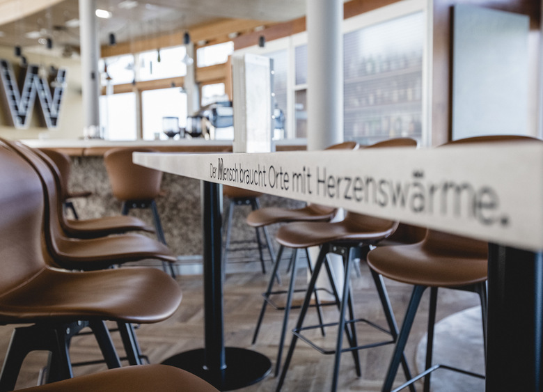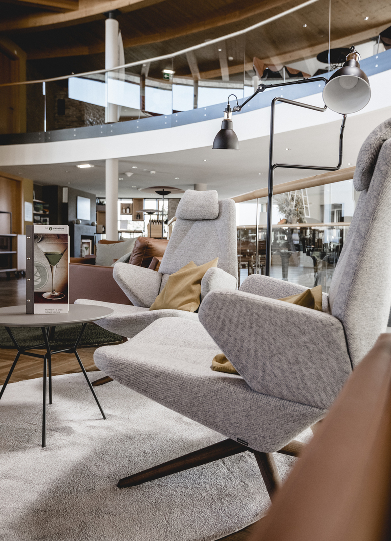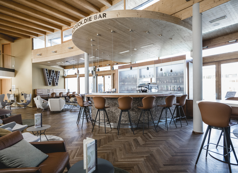 In der Mitte – sozusagen im Herzstück der Wasnerin liegt die Hotelbar. Diese wurde von Grund auf neu aufgewertet. Der bestehende Fischgrät-Parkett wurde aufgefrischt und mit neuen Farben und Naturmaterialien wie Stein, Pfefferminze, Leder und Loden kombiniert. Die gesamte Möblierung wurde ausgetauscht und das neue Konzept bietet verschiedene durchmischte Sitzmöglichkeiten für Jung und Alt. Hochsitzen trifft auf gemütliche Lounge-Chair Atmosphäre und daneben lässt es sich auf der knautschigen Couch gut kuscheln. Das in Teilbereichen neue Beleuchtungskonzept unterstützt die Wohlfühlatmosphäre.