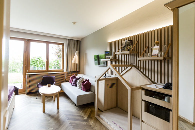 organischen Wänden mit Holz eingebaut und ergeben mit hochwertigen Designerstücken wie Bett oder Ohrensessel ein Wohlfühlambiente für Jedermann. Die Zimmer bieten zusätzlich noch alles, was das Herz eines Vierbeiners begehrt. Die neue „WOW!“ Suite zeichnet sich durch getrennte Wohn- und Schlafräume, verschiedenste Schlafplätze + Spiele Stationen für den Vierbeiner sowie einem eigenen Badezimmer mit Hundedusche aus. Der großzügige Garten mit Bergpanorama rundet den WOW! – Effekt ab.
