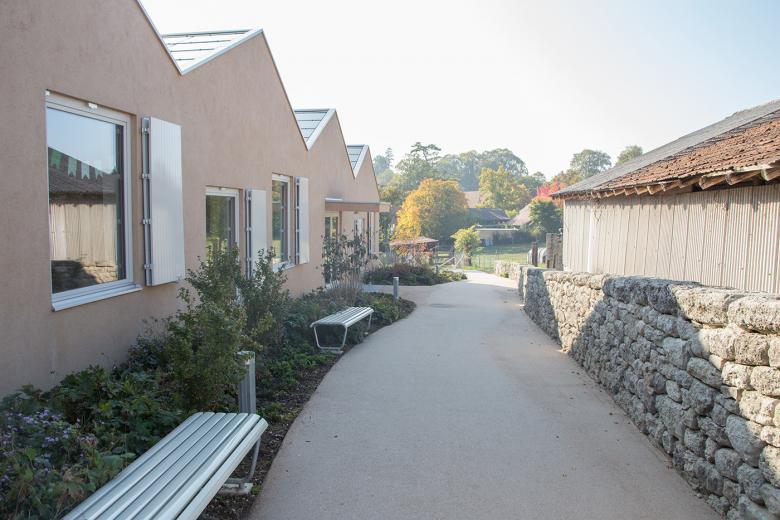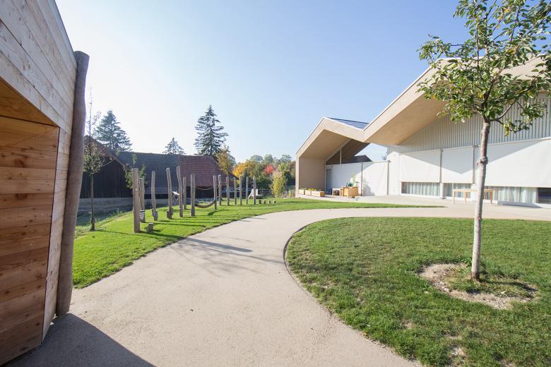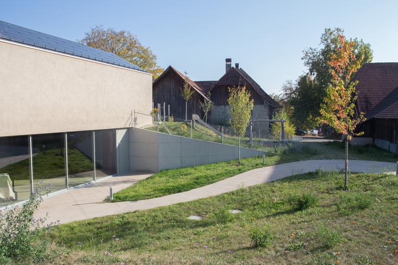 Das Grundstück „Himmelrych“ befindet sich zwischen zwei verschiedenen Bebauungsstrukturen; dem Ende der historisch gewachsenen Dorfstruktur und dem orthogonalen Muster der Primarschule Ins. Das Projekt spinnt das vorhandene städtebauliche Prinzip der Schule weiter. Der neue eingeschossige Bau bildet so den Abschluss des bestehenden Pausenplatzes, ohne dessen Qualität zu beeinträchtigen, und ermöglicht, im Süden die Hostet für die Kindergärten zu erhalten. Die Ostfassade bildet ganz selbstverständlich einen Auftakt mit grosszügigem Vorplatz. Entlang der Nordfassade verläuft die Erschliessung des Kindergartenbereiches. Auf diese Weise kann der Freiraum im Süden der Verlängerung der Kindergartenbauten in den Aussenbereich vorbehalten werden. Die bestehende Kulturlandschaft – die Hostet – bleibt als Grundstruktur des Freiraumes erhalten und wird mit Spielflächen und Ausstattungen ergänzt. Im Vorland des sich nach Westen orientierenden Musikzimmers erweitert sich der Fussweg zu einer Platzfläche, die den Gelenkpunkt mehrerer Wegebeziehungen darstellt sowie mit Baumpflanzungen, Bänken und Brunnen zu einem attraktiven Aufenthaltsort wird.