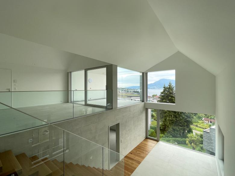 Die Lage des dreieckigen, schmalen Grundstücks ist gegen Osten geprägt durch eine herrliche Aussicht auf den Vierwaldstättersee, im Westen grenzt es unmittelbar an die Autobahn. Davon ausgehend wird das Raumerlebnis entwickelt mit einem über drei Geschosse organisierten Wohnen.
