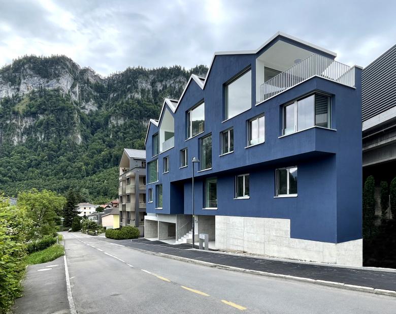 Abschliessbare Zimmer und Nasszellen werden so gestapelt, dass ein vertikaler Bewegungsraum mit wechselseitig angeordneten Köpern mit auskragenden Treppen entsteht. Die vertikale Erschliessung wird zum Ort, wo man die spezielle Lage des Hauses erlebt. Man bewegt sich immer entweder gegen den Hang oder mit Blick auf den See. Der «Kluftraum» geht nahtlos in die Wohnräume über. Durch diesen erlebnisreiche Raumfluss entsteht Grosszügigkeit.