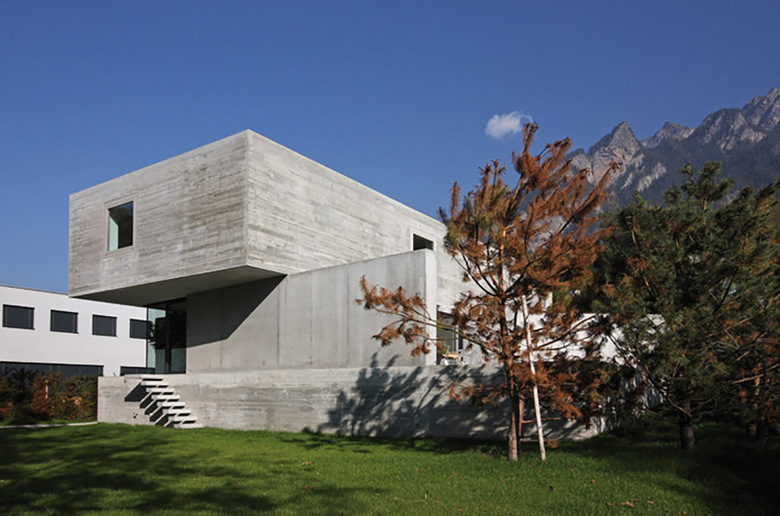 Aufgrund des Strassenverlaufs rund um das geneigte Baugrundstück und der Bedürfnisse der Bauherrschaft nach Privatheit entstand dieses zunächst introvertiert, fast abweisend wirkende Einfamilienhaus. Drei in der Grundrissanordnung unterschiedliche Geschosse werden zu einer zusammenhängenden Sichtbetonskulptur gestapelt. Die Anwendung von Ortbeton mit zwei unterschiedlichen Schalungstypen und die damit differierende Oberflächenstruktur fügt die unterschiedlichen Geschosse zu einem Ganzen und unterstützt die Skulpturalität des Gebäudes.
